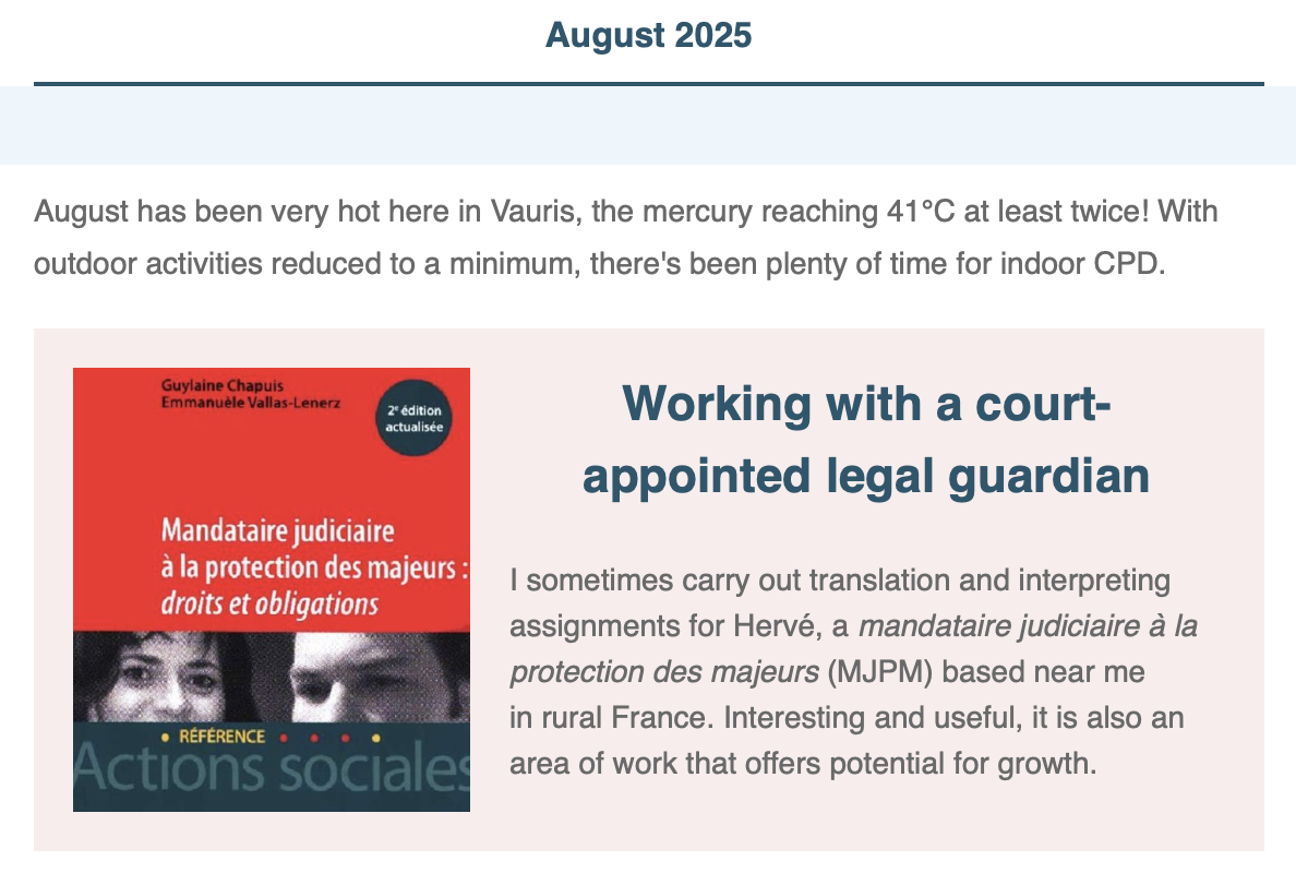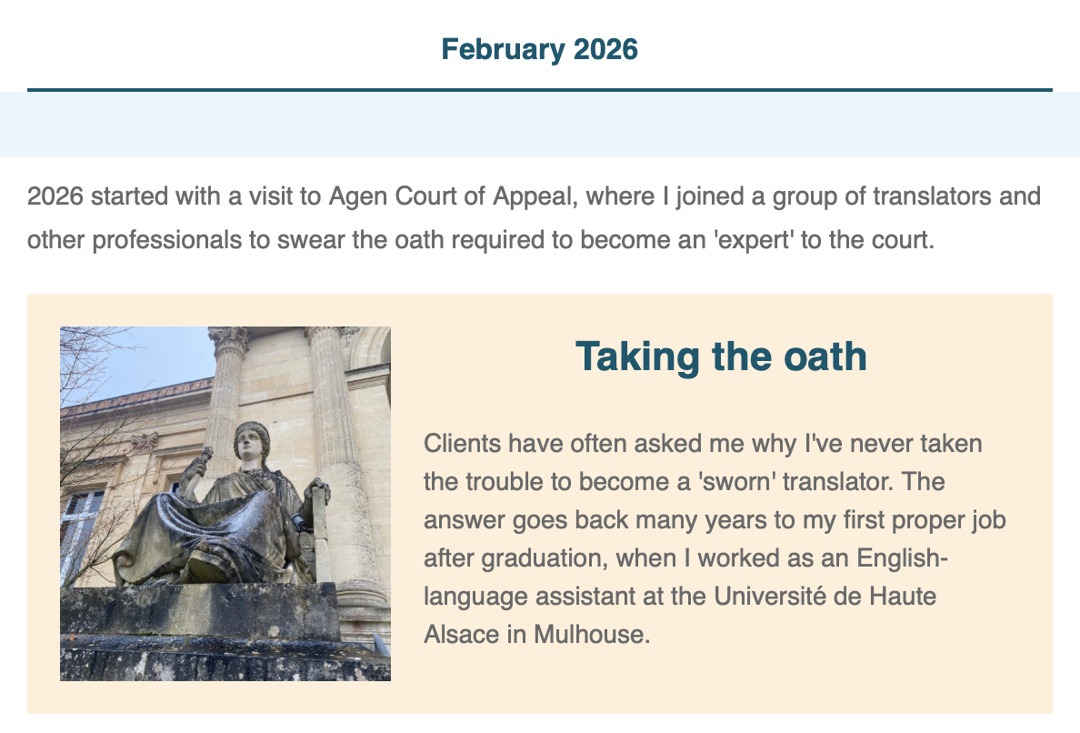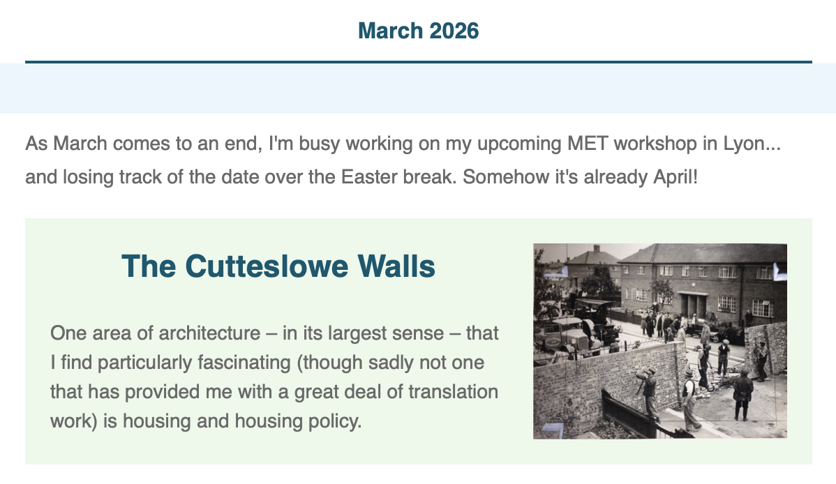 If you’d like to know more about my practice and what’s going on in the world of translation, why not take a look at my newsletters. To sign up for your monthly copy, just fill in the form below.